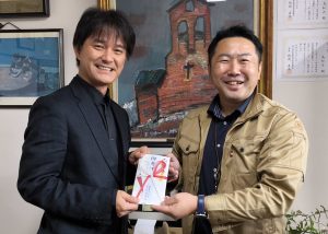(株)マツワ 社長 松岡智也 様(右)より当法人理事長の藤野謙一が受け取りました。