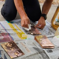 そして、いよいよ銅板に選んだ文字を浮かび上がらせていきます。