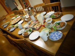 夕食は、お寿司・ピザ・チキン・サラダ・ケーキなど豪華でした!