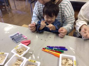 工作の時間には、自ら選んだ木材に色をつけて、マグネット飾りを作りました。